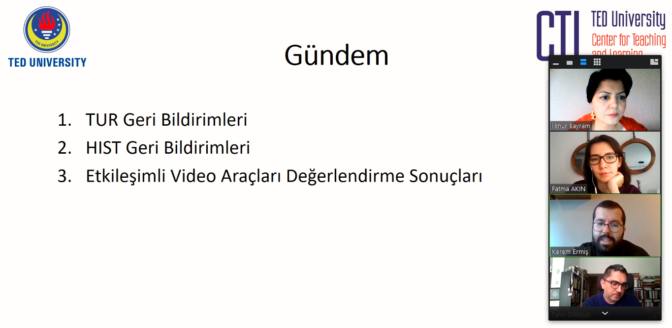 Öğretim görevlilerimiz Fatma Akın ve Fahri Dikkaya ile 2021 Güz döneminde ilk kez asenkron olarak yürütülen Türkçe ve Tarih derslerini öğrenci geri bildirimleri doğrultusunda değerlendirdik. Eğitim teknolojileri uzman yardımcımız Kerem Ermiş tarafından tematik bir şekilde analiz edilen öğrenci geri bildirimleri ışığında 2022 Bahar döneminde derslerin tasarım, etkileşimli videolar, öğrenci ile iletişim ve değerlendirme gibi önemli alanlarında gerçekleştirilecek muhtemel iyileştirmeleri ve alınabilecek tedbirleri tartıştık.