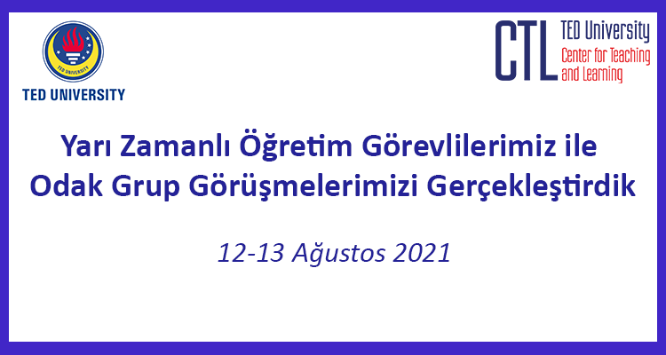 12-13 Ağustos 2021 tarihlerinde farklı fakültelerde yarı zamanlı olarak görev yapan öğretim görevlilerimizin katılımlarıyla gerçekleştirdiğimiz odak grup görüşmelerinde eğitim-öğretimde güçlü ve gelişime açık yönlerimiz ve yarı zamanlı öğretim görevlilerimize sunulabilecek destekler konularında fikir alışverişinde bulunduk.